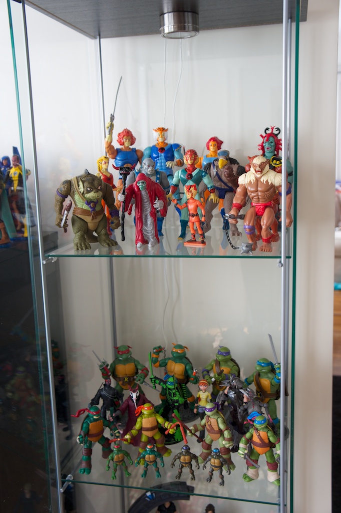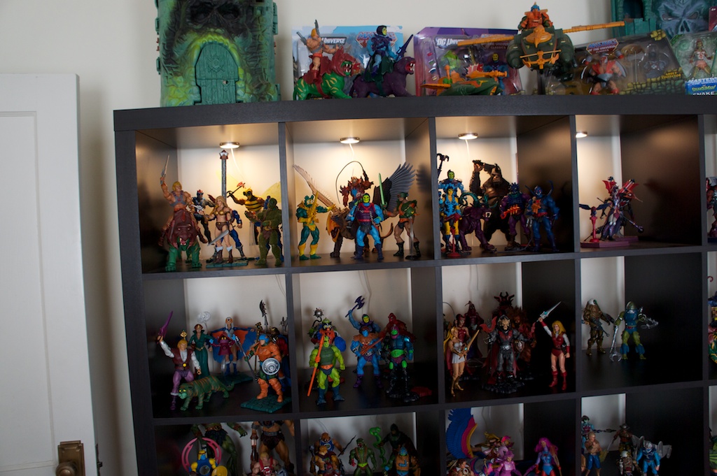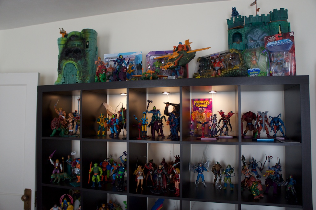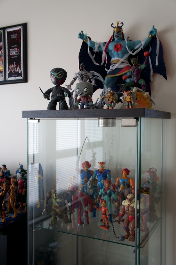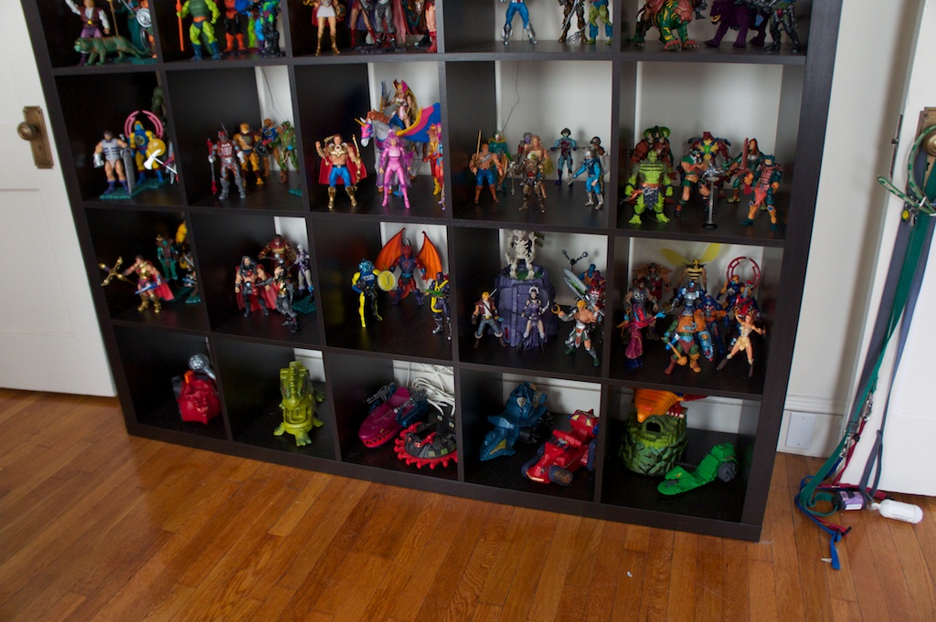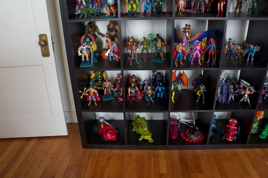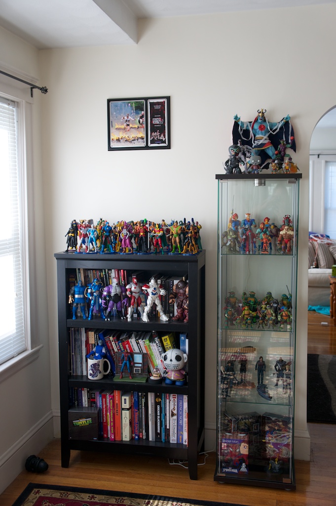 Ever since I was young, I’ve had a bit of an obsession with toys. Especially action figures. Being a child of the 80’s I grew up with the like of He-Man and She-Ra, Ghostbusters, Teenage Mutant Ninja Turtles, Thundercats, Silverhawks, GI Joe, and Voltron to name but a very few. I’ve always been pretty creative. I was constantly drawing and building things when I was a kid. I think the combination of my love for these characters along with a deep appreciation for the artistry of sculpting articulated action figures and other toys has completely rekindled my love for these toys as an adult. Now that we have moved into our own place just outside of Boston, the wife has reluctantly allowed me to display parts of my collection. Currently I have about 70% of my modern and vintage toys set up around the apartment. I’m excited to share some pictures of the displays here.