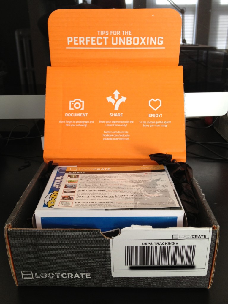 Today I received my first ever Loot Crate. If you don’t know what that is, it’s ok. You soon will. Loot Crate is a monthly subscription box service where they ship you a box of cool geek / gamer culture related items. I was so pissed that I missed out on last months one because of the “Tardis Prime” shirt and the “Sharks with freaking lazer beams” can coozie. We had been told ahead of time that the topic for this month was “Cosmos”. And oh man did they not disappoint. So without further delay…