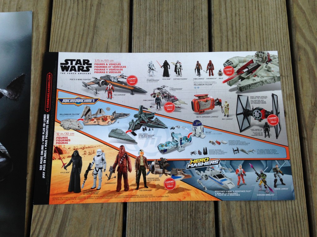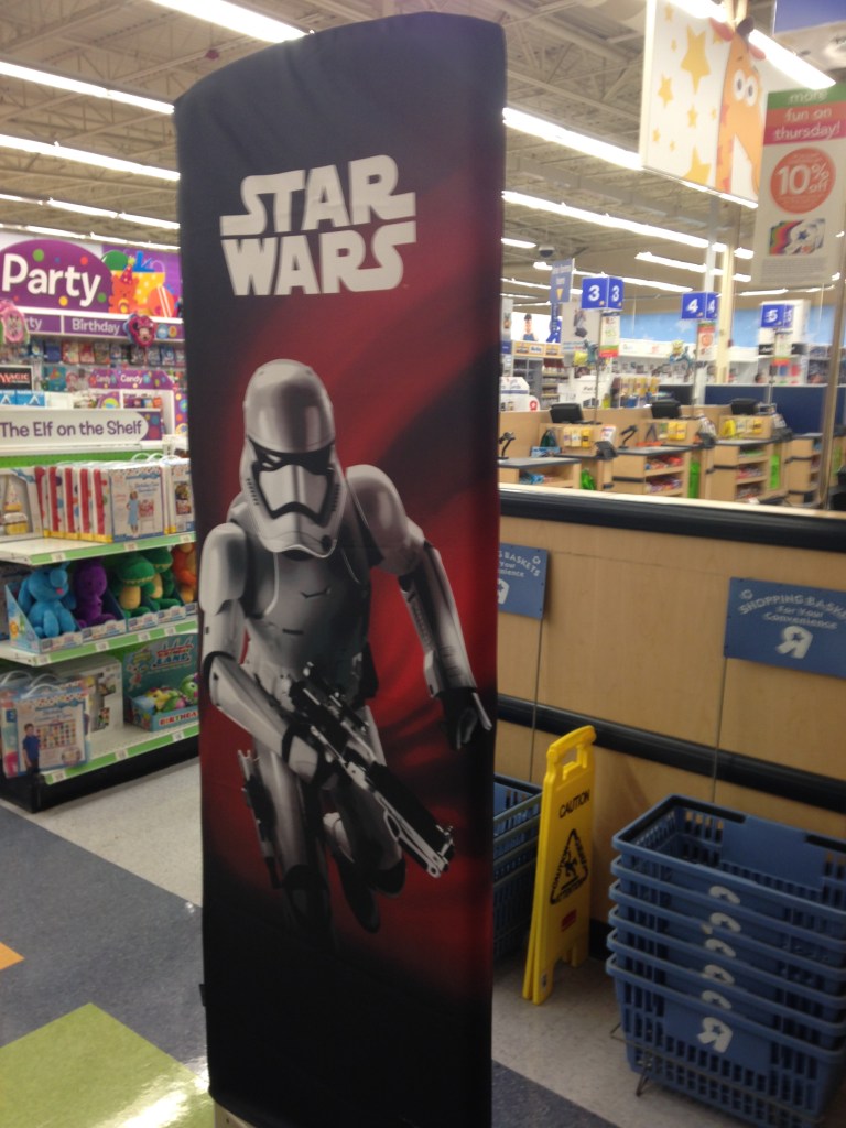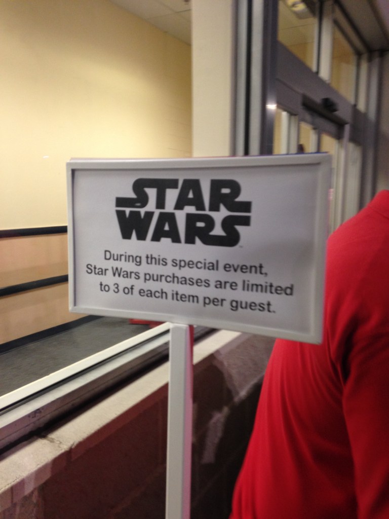 By the time the doors opened there was 50 or so people in line. Luckily since I was near the front I got first dips on the goods. They did a bit of people management so not everyone rushed in at once. The manager came outside about 15 minutes before to let us know how it was all going to work. I was really impressed by how organized it all was. When we walked in we were handed some nice freebies: Kylo Ren poster, a Hasbro toy guide poster, and a Force Awakens Lego piece.