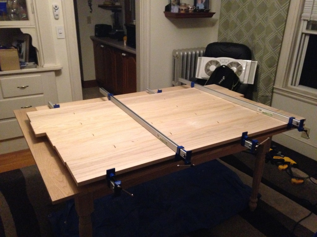 I would up with an insert that fit super tight. There was not enough clearance to allow for the wood to swell in the summer correctly. In attempting to remedy this I managed to really fuck up the insert by cutting it too short on one end. I then had the bright idea of cutting it in half and doing adding a piece down the center perpendicular to the other boards. But again, I ran into issues making this happen with imprecise tools and uneven boards. So currently that part is on hold. I think I may eventually try to build leafs instead of one large piece.