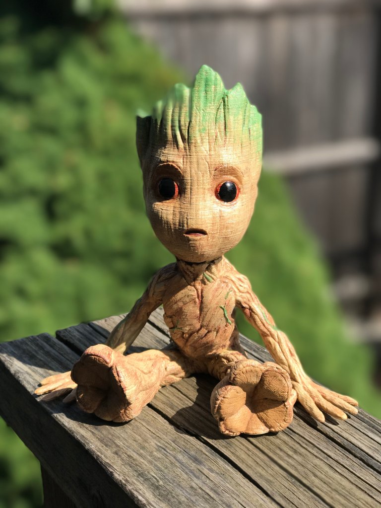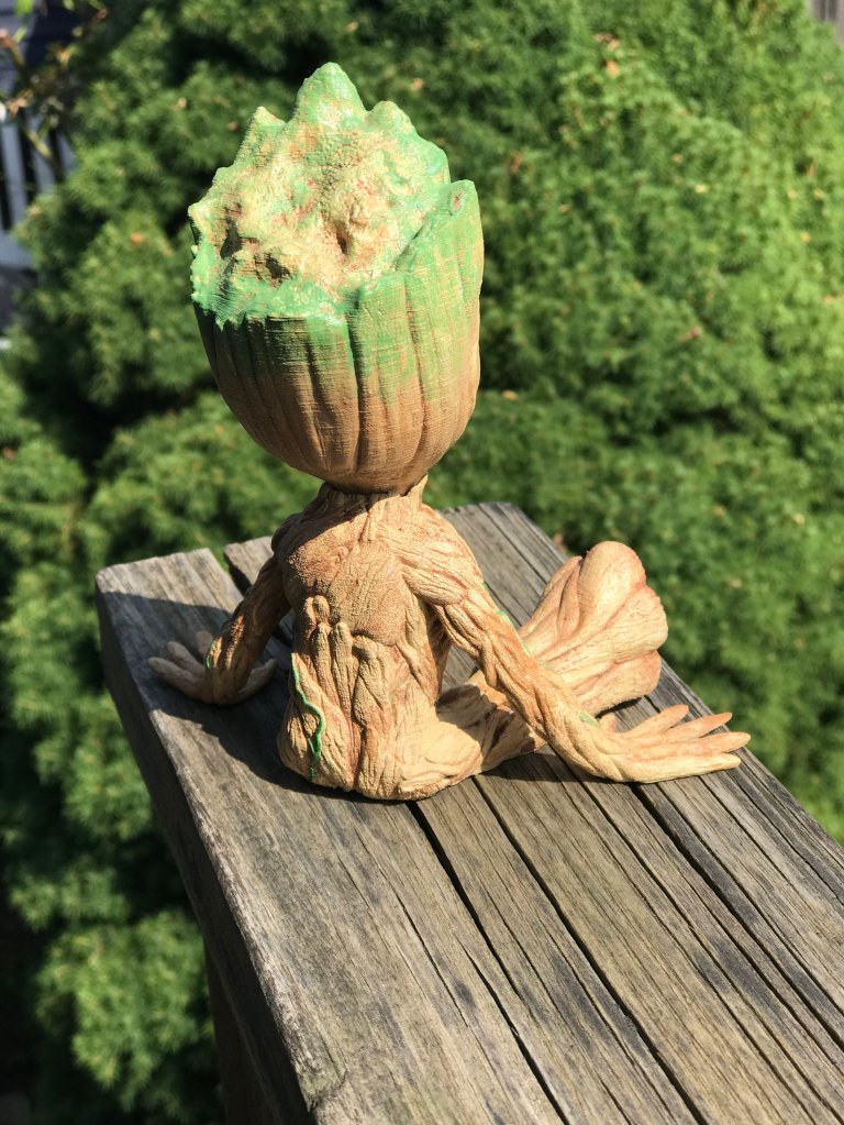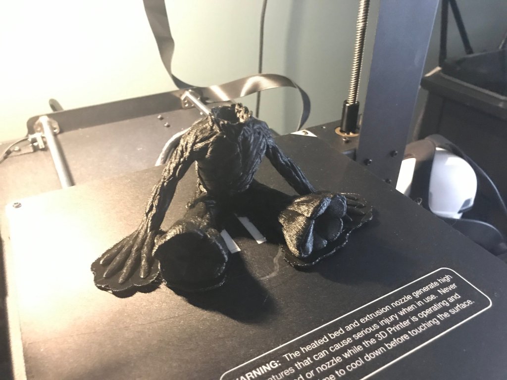 One of the first things I printed was an amazing baby Groot from Guardians of the Galaxy. The model is by user Byambaa on Thingiverse and you can download it here. It printed in two parts. I chose the lower resolution models since they were a bit easier to work with. I ran into a bit of adhesion problems, especially with the hands on the body, so I did use rafts for the prints.